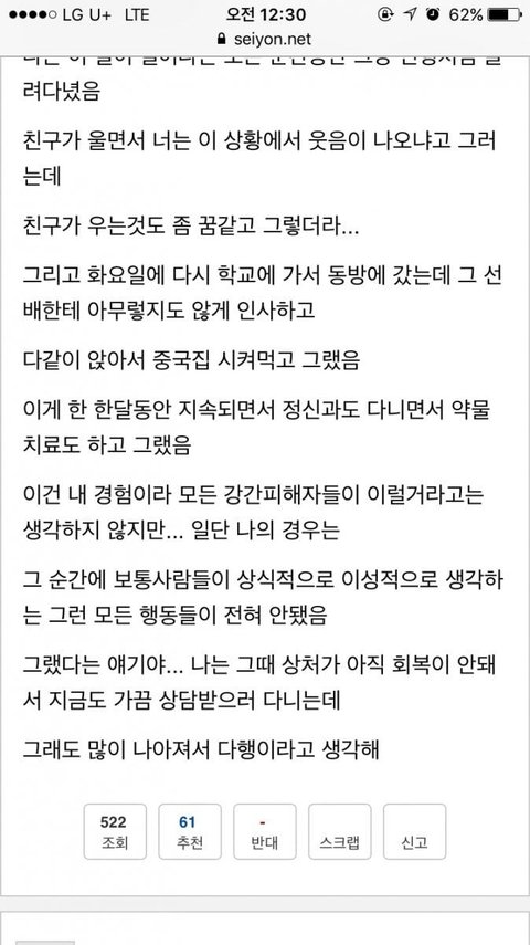 성범죄 피해자가 가장 해명하기 힘든 부분이 이 지점이라 함. 당한 다음 날 멀쩡하게 밥먹고 공부하고 출근하고 희희덕 거리고 일상 생활을 다 한다함. 그러니 너도 즐긴거 아냐? 하는 비아냥 의심을 받는다 함. 그런데 이건 모두 현실부정 현상이라 함. 감당할 수 없는 고통을 무의식으로 밀어놓고 기억에서 아예 삭제하는 건데 후에 스멀스멀 올라와서 고통스러운데 시간이 자니서 증명도 어렵고 하니 트라우마가 되는거지.