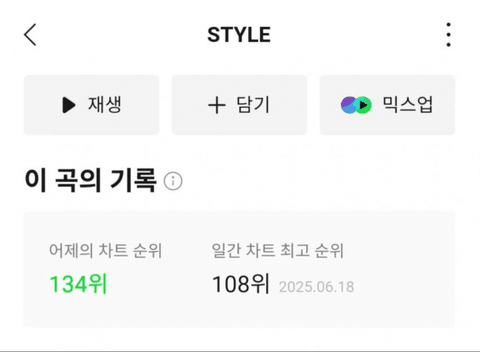 하투하 미진입 일간 108위로 시작해서 하루만에 -26위 빠져서 134위 걍 노래 개처구리고 미감 빻아서 개망했는데 큐떱도 구려 반응 개좋은 올데이도 구려구려 노래구려~ 빌려온 고양이 구려 키오프구려 구려무새하던 정병판에서 베댓주작해서 스타일만 노래 좋다함 ㅋㅋ 슴창퀴들 어휴 ㅋㅋ