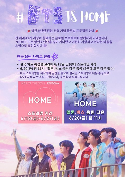 오늘 밤 11시 방탄 군대 해방 기념 다운 총공있어 글로벌 프로젝트인거 알고 있지? 아래 ㄱ소리같은건 신경쓰지말고 오늘 밤 11시 다운하고 27일까지는 스밍할때 HOME 포함하기 꼭 해줘