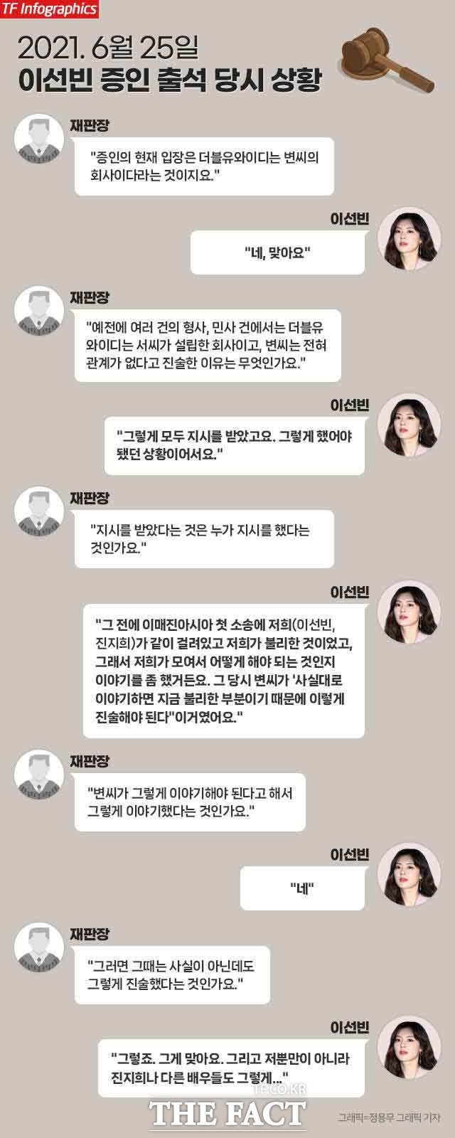 같은 사안에 대해 검찰과 법정에서 정 반대 진술을 함으로써 파문을 일으킨 배우 이선빈./더팩트 DB구 씨의 주장에 따르면 2016년 검찰조사에서 이선빈도 똑 같이 "더블유와이디는 변 씨와 관계가 없다"고 진술했으나, 2021년 법정에서는 불리할 것 같아 당시 거짓 증언했다면서 밝힌 "더블유와이디는 변 씨 소유가 맞다"는 내용은 위증이 될 수 있다. 진지희의 소속사 관계자도 "이선빈이 법정에서 했던 증언은 사실과 다르다"면서 "진지희는 이선빈과 모여서 (진술을 위해 )어떻게 해야 할지 이야기를 나눈 사실이 없고, 당시 검찰 참고인 조사도 진지희를 대신해 어머니가 받았다"면서 미성년자인 진지희가 이선빈과 진술 협의를 했다는 것은 말이 되지 않는다고 말했다.