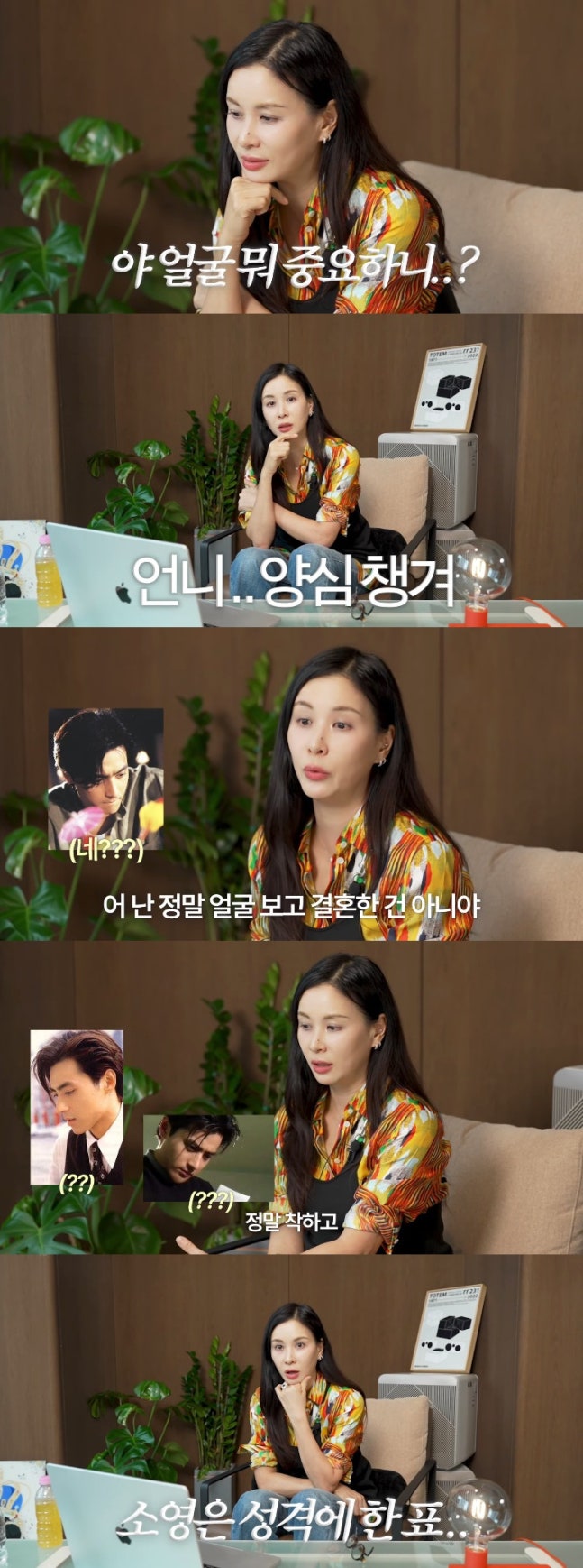 이날 한 구독자가 잘생긴 외모와 잘 맞는 성격 중에 어떤 걸 선택하는 게 좋을지 묻자 고소영은 "옛날에 맨날 그런 얘기 했다"면서 말문을 열었다.