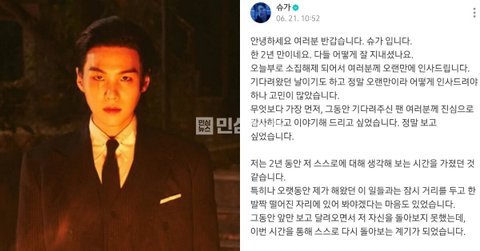 2년간의 공백기를 마치고 돌아온 슈가는 다시 음악 활동을 이어갈 예정이다. 이번 메시지는 그의 새로운 출발을 알리는 진심 어린 다짐으로, 앞으로의 행보에 이목이 집중되고 있다.