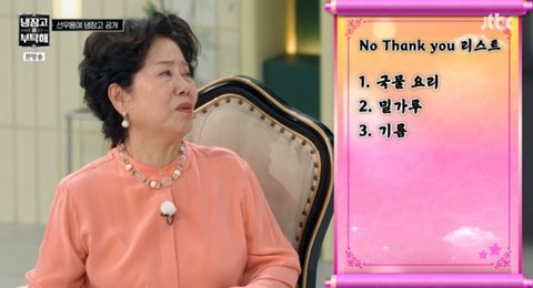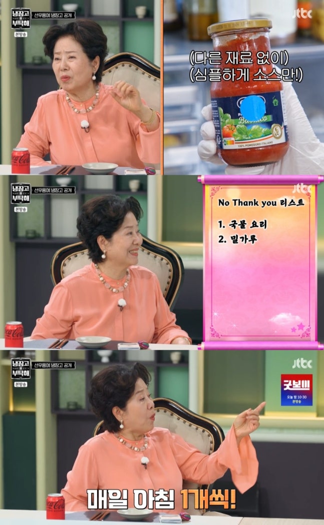 이어 선우용여는 "저는 스파게티도 토마토 스파게티 소스에 양파 정도만 넣는 게 좋다. 거기에 달걀 스파게티면. 밀가루는 '노땡큐'다"며 밀가루를 기피한다고 밝혔다.