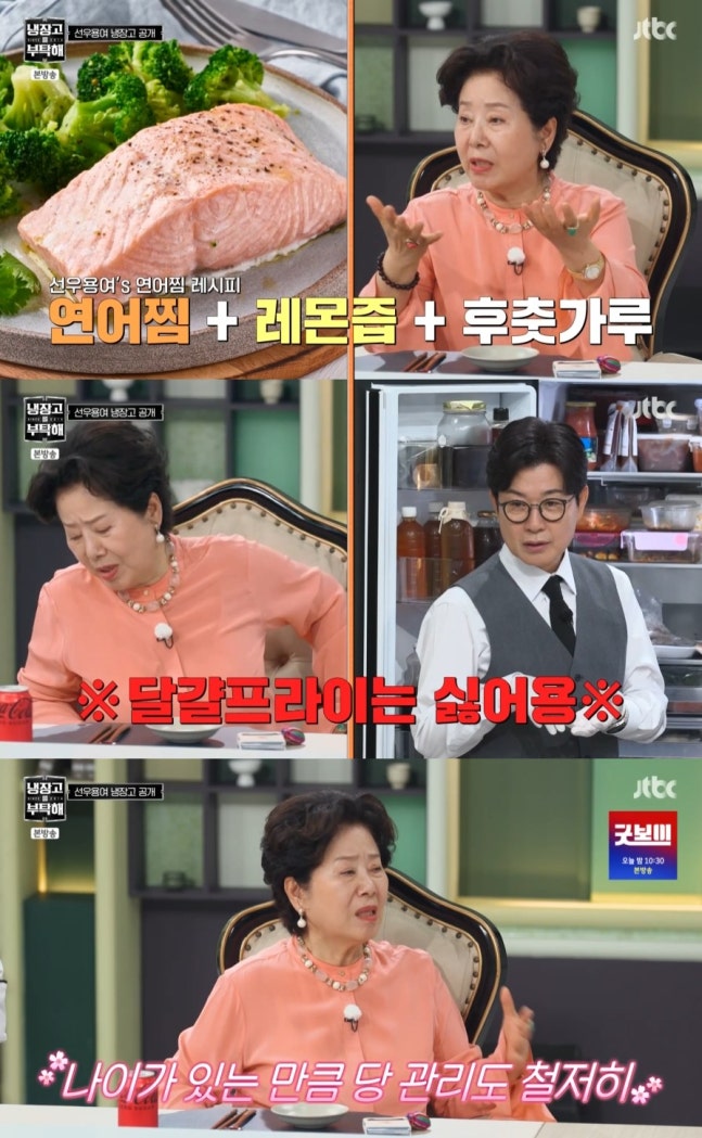 선우용여는 남다른 해산물 사랑도 자랑했다. 그는 "주로 연어를 쪄서 먹는다. 그래서 (냄새를 잡기 위해) 레몬즙과 후추를 넣어서 먹는다"고 말했다.