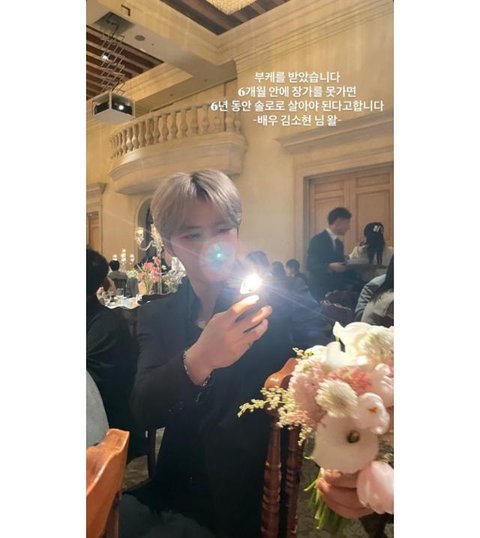 김재중은 지난 21일 자신의 SNS에 "부케를 받았습니다. 6개월 안에 장가를 못 가면 6년 동안 솔로로 살아야 된다고 합니다. 배우 김소현 님 왈"이라는 글과 함께 사진을 게재했다. 공개된 사진 속 김재중은 한 손에 부케를 들고 휴대폰으로 촬영하고 있다.