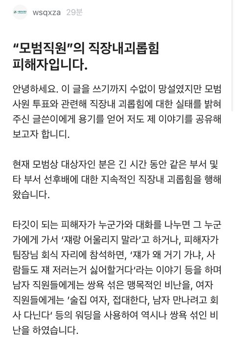 술자리 좋아하는 팀장 비위 잘 맞추고 샤바샤바해서 모범상 줘버림
