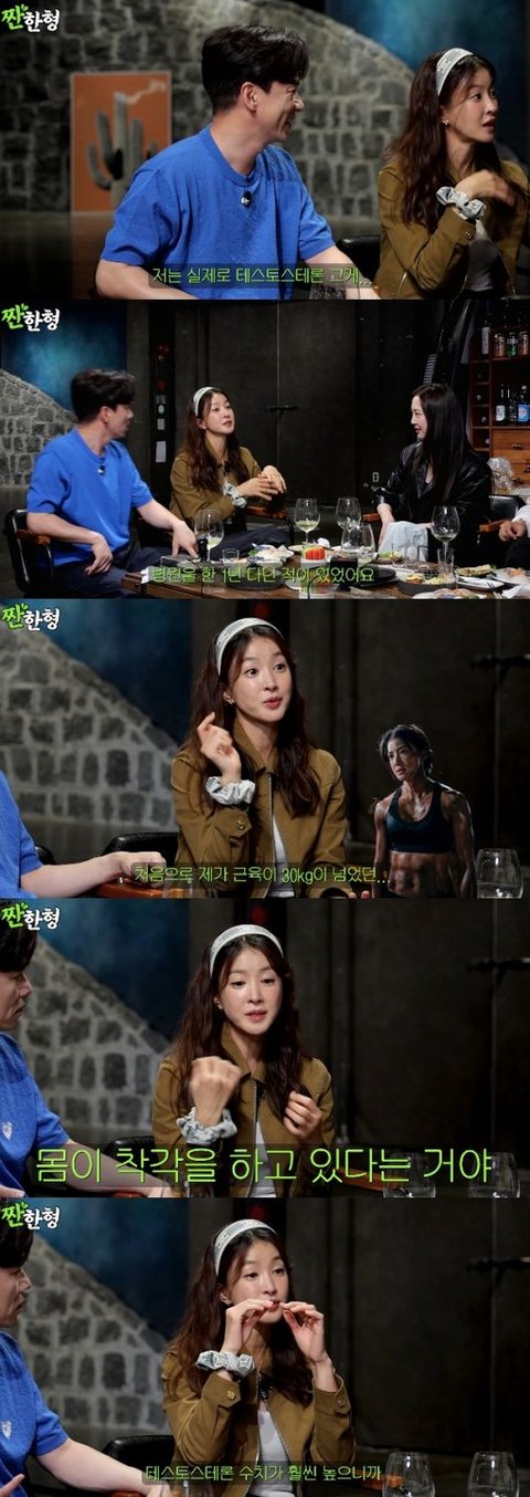 이시영은 “실제로 테스토스테론이 너무 높아져서 병원을 1년 다닌 적이 있다. ‘스위트홈’ 찍으면서 저의 운동과 영혼을 다 끌어모아서 한 것이다. 처음으로 근육이 30kg이 넘은 것이다. 체지방률은 6% 정도”라고 설명했다. 신동엽은 깜짝 놀라며 “남자 6%도 말이 안 되는 것이다”라고 설명했다.