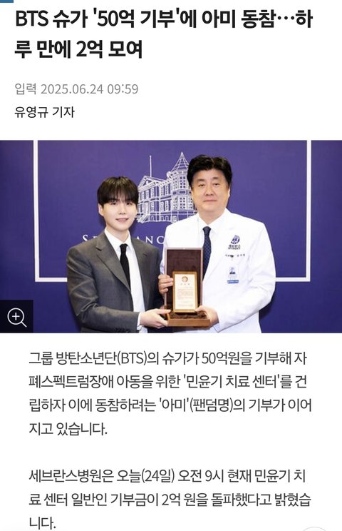 세브란스병원은 23일 서울 신촌 연세의료원 제중관 1층에서 ‘민윤기 치료센터’ 착공식을 열었다고 밝혔다. 이 센터는 슈가가 기부하기로 한 50억 원의 기부금으로 지어질 예정이며, 연예인 개인이 연세의료원에 기부한 금액으로는 역대 최고액이다.