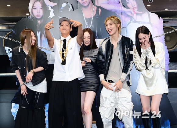 신인 혼성 그룹 올데이 프로젝트가 23일 오후 서울 강남구 역삼동 일상비일상의틈byU+에서 열린 ALLDAY PROJECT(올데이 프로젝트) 데뷔 기념 팝업 스토어 오픈 포토콜 행사에 참석하고 있다. (왼쪽부터 베일리-타잔-영서-우찬-애니) [사진=정소희 기자]