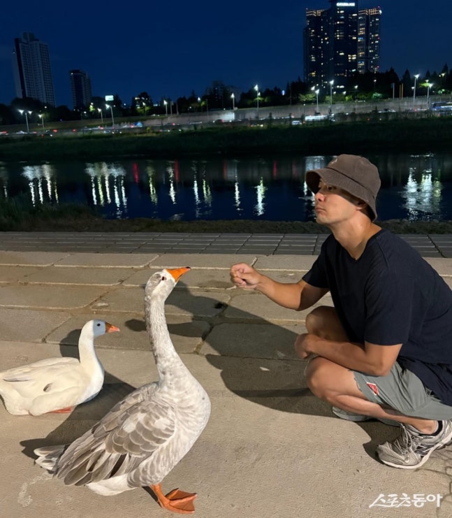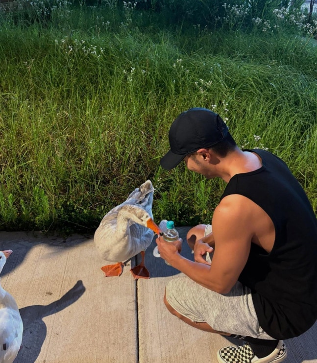 사진 속 김지석은 운동복 차림으로 도심 산책길에서 거위와 마주한 모습이다. 반소매에 반바지 차림으로 편안한 복장을 한 그는 거위와 눈을 맞추고 몸짓을 흉내 내며 교감을 시도해 눈길을 끌었다.