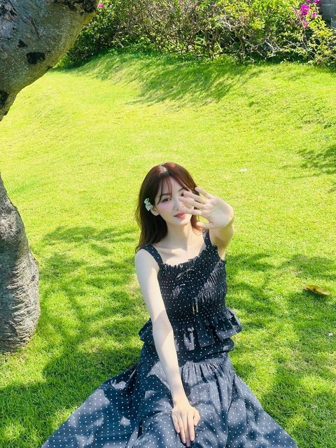 사진은 따사로운 여름 햇살을 그대로 담아낸다. 조이현은 검은색 바탕에 작은 흰 점이 들어간 민소매 원피스를 입고, 자연스럽게 풀어진 긴 머리 한쪽에 흰색 꽃을 꽂았다. 부드러운 미소와 함께 손을 들어 햇빛을 살짝 가리는 그녀의 모습에서는 청아함과 소녀다운 순수함이 동시에 드러났다. 촬영 장소로 추정되는 야외 잔디밭은 울창한 나무와 초록 빛깔로 가득 채워져, 싱그러운 계절감을 더했다.