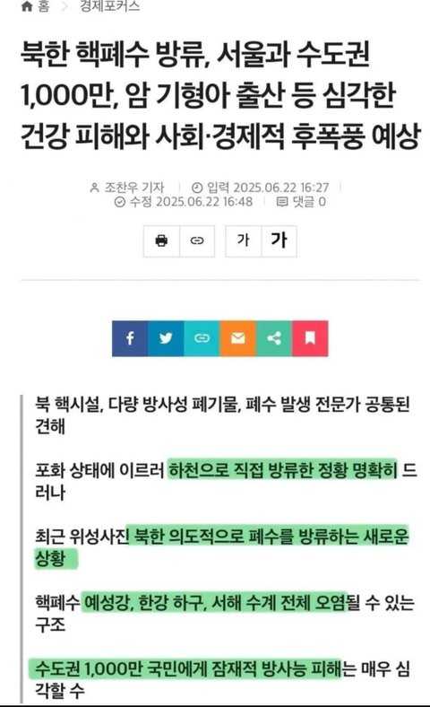 정작 우리나라선 북한 핵폐수 방류 기사 모두 삭제됐다함 ㅋ