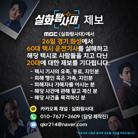 MBC <실화탐사대>에서는 26일 경기 화성에서 60대 택시 운전기사를 살해하고 해당 택시로 사람들을 치고 다닌 20대에 대한 제보를 기다립니다.