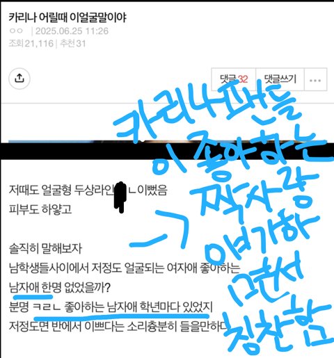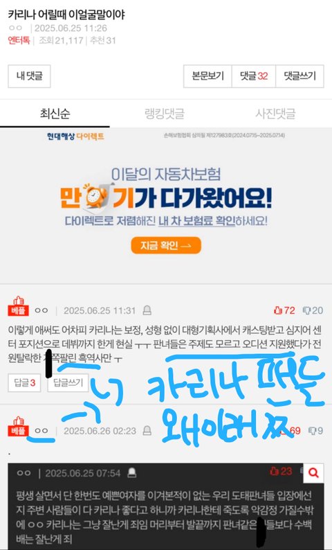 어떤 사람이 카리나 어릴때 이 얼굴 말이야 라고 제목 쓰면서 카리나팬들이 너무너무 좋아하는 남자,짝사랑 얘기하면서 카리나를 칭찬하는데도 추하게 댓글로 부들부들대면서 남을 욕하는 댓글을 쓴다음 베플에 올리고 막 난리치는거 보면 좀 많이 이상하다고 해야되나??아무튼 카리나팬들은 카리나를 칭찬하는 글에서도 왜 저러는건지 심리를 이해 못하겠음 카리나팬들아 니들이 그렇게 좋아하는 남자,짝사랑 얘기하면서 카리나를 칭찬했으면 좋아해야 하는거 아님?ㅋㅋㅋ이해가 안가노..ㅉ