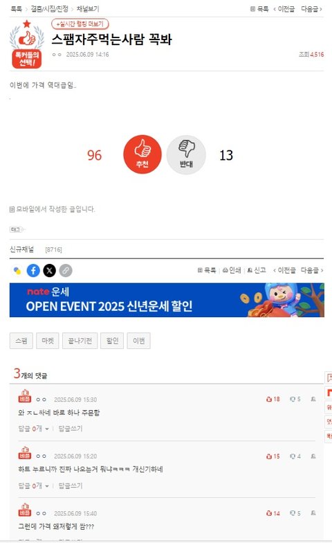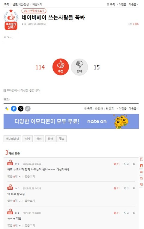 전에는 스팸이 이런식으로 광고글 올라오더니 이제는 똑같은 내용으로 네이버광고?댓글 달면 5초내로 바~~~~~로 삭제하고 네이트 고객센터에 문의하면해당글은 삭제했다하며 계속 신고넣어달라는 말뿐이네요솔직히 광고올리는거 좋은데 댓글까지 다 삭제시키니 기만하는거 같아 정말 불쾌하네요