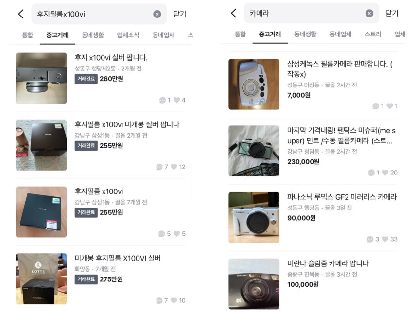 ▲ 중고 거래 플랫폼의 카메라 거래 현황ⓒ 한동희중고 거래 플랫폼인 당근마켓에서 카메라 매물을 검색해 보니, 가격이 예상보다 훨씬 높게 형성되어 있었다. 특히 2024년에 출시된 디지털카메라 '후지필름 X100Vi'는 출시가 약 209만 원임에도, 품귀 현상으로 인해 중고 거래가 훨씬 높은 가격에 이뤄지는 경우도 있었다. 이처럼 특정 모델에 한정되지 않고, 오래된 필름 카메라부터 최신 카메라까지 다양한 제품들이 예년보다 높은 가격대에 빠르게 거래되고 있다.