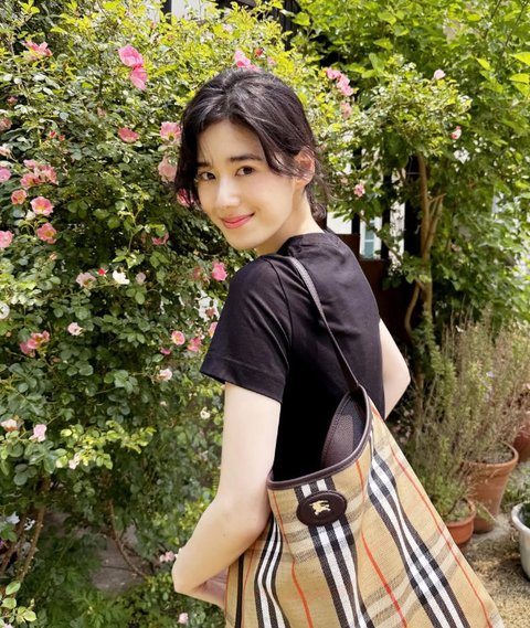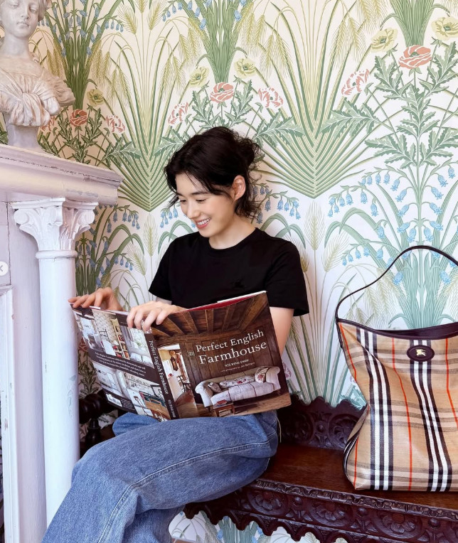 사진 속 정은채는 검은 티셔츠에 청바지를 착용한 모습. 다소 밋밋할 수 있는 패션이지만 B사의 숄더백으로 멋을 냈다. B사의 트레이드 마크인 클래식한 체크 패턴이 정은채의 고급스러운 분위기와 어우러졌다.