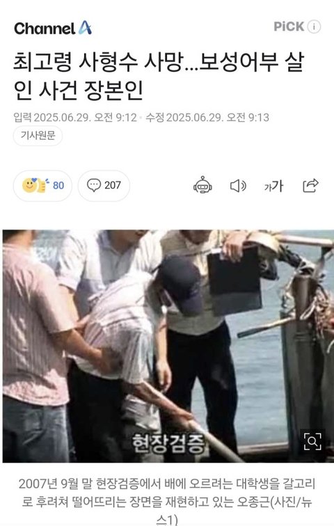 보성 어부 살인 사건’의 장본인 오종근이 복역 도중 지난해 숨진 사실이 뒤늦게 알려졌습니다. 사망 당시 87세로 국내 최고령 사형수였던 오종근은 2007년 전남 보성에서 성추행을 목적으로 대학생 커플 등 4명을 선상에서 연쇄 살해했습니다.