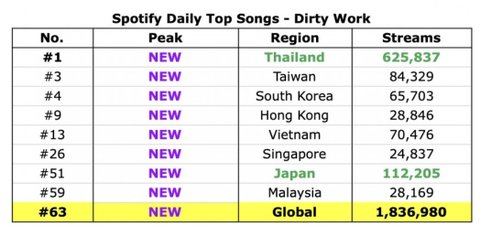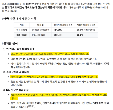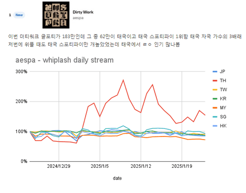 자랑할려고 가지고 온거 같은데 팩트로 때려맞고 싶은거지? 팩트만 말하면 태국멤있는 그룹보다 더 높은 태국 스밍비율로 글포티 하위권 끝자락 진입한거고 대형 플리 배너걸고 프로모 돌렸는데 미포티 미진입에 가장 많이 뛰어넘겨진 곡으로 신기록 세움