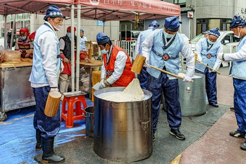 한복 입은 사람들이 떡을 치고 한국의 재래시장과 흡사하다.
