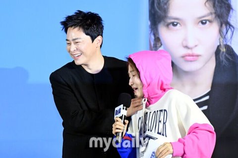 [마이데일리 = 곽경훈 기자] 30일 오전 서울 용산 CGV에서 진행된 영화 '좀비딸' 제작보고회에서 조정석이 좀비 분장을 한 박경림에게 장난을 치고 있다.