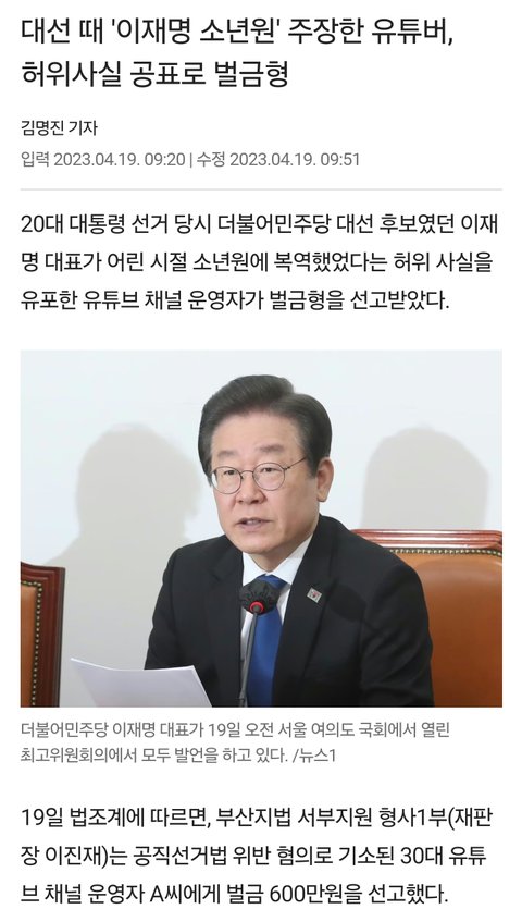 야 이재명 소년원 허위사실유포로 벌금 얼마나 받았나 검색해 봐 이 빡대갈아