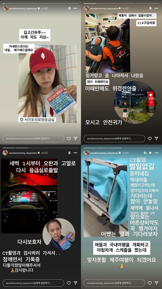 이윤미는 지난달 30일 자신의 소셜 미디어 계정 스토리에 “길고 긴 하루. 이제 저도 자요. 자세한 스토리는 내일 이야기해드릴게요”라는 글과 함께 ‘서귀포 의료 응급실’ 위치를 남겼다.
