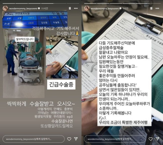 [OSEN=장우영 기자] 배우 이윤미가 남편 주영훈과 제주도 여행 중 날벼락을 맞았다. 응급센터 출입증을 공개하며 큰 충격을 안긴 이윤미는 길고 길었던 그날을 팬들에게 공개하며 위로를 받았다.