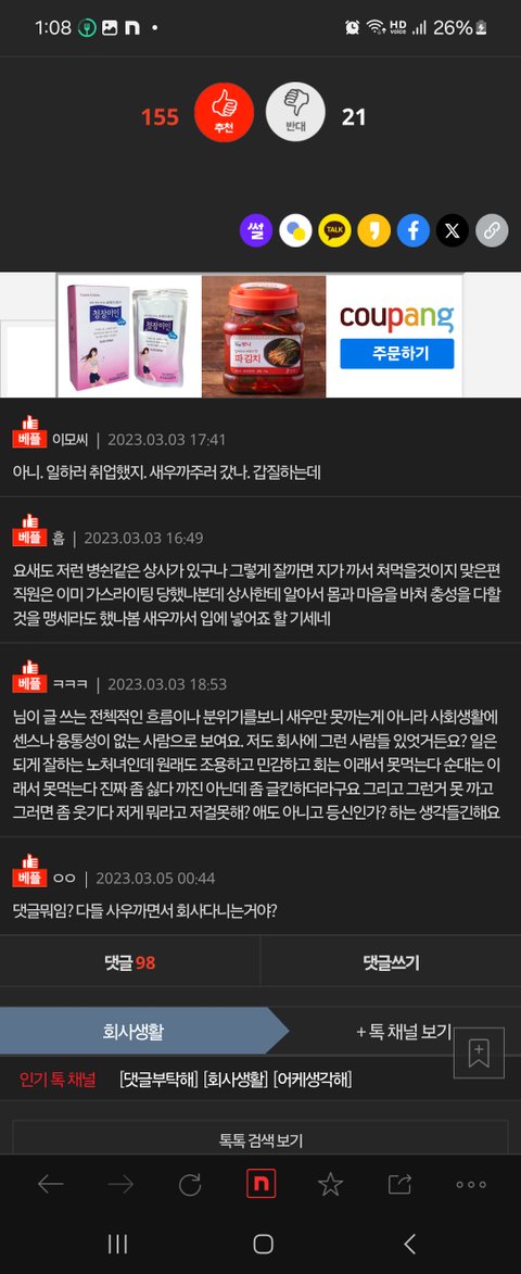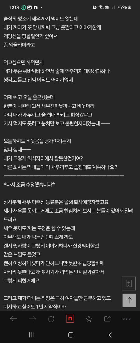 남의 직장 포섭하고 침투하고 스토킹하고, 사이버불링하는 대뇌망상들. 새우 사이버불링 끔찍하다. 오랜시간 연락하던 사람도 너희 대뇌망상 직장 슈가대디 아니고 사연이 있어서, 만나지 않고 보살핀다는 유부남 사람이었고 불륜 전혀 아님. 또 챙겨주던 돌싱 직장친구를 슈가대디로 대뇌망상하는 또라이들 유부남도 불륜도 아님. 난 답답해서 밖을 나가고 싶어도 따라올테니깐 면접을 다 떨어트렸어. 못나가는 이유를 스토킹이라고 말못해서 항상 아무렇게나 뻥을쳤어.. 슈가오빠 미안 오빠 좋은사람임! 스토킹당해서 밖에 기를 쓰고 안나갔음요.