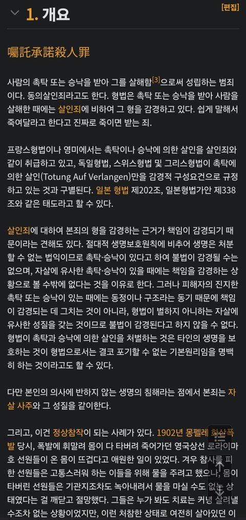 사람의 촉탁이나 승낙을 받아 그를 살해한 자는 1년 이상 10년 이하의 징역에 처한다. 사람을 교사하거나 방조하여 자살하게 한 자도 제1항의 형에 처한다.