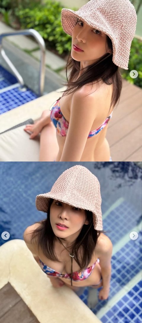 사진 속 산다라박은 화려한 무늬의 비키니를 입고 늘씬한 몸매를 자랑한다. 산다라박은 군살 없이 탄탄한 몸매를 보여준다.