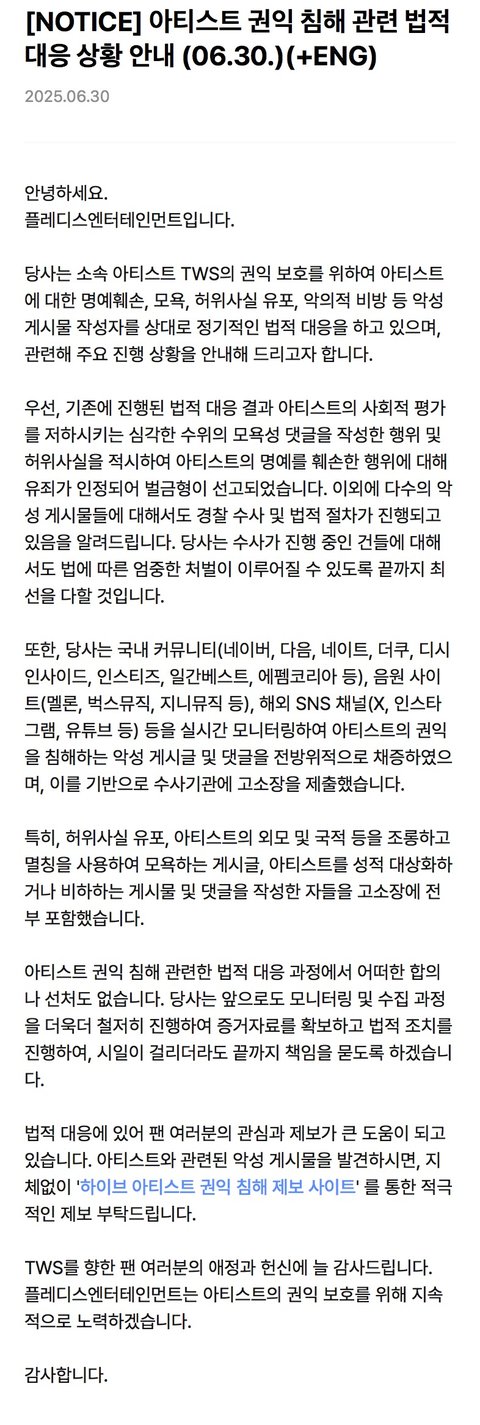 투어스 팬들아 판 더쿠 인스티즈 등등에서 투어스 인신공격하거나 사재기 등등으로 까는 글, 댓글들 다 피뎁 따서 보내셈 이번 고소는 통고소라 아예 게시물 전부 통으로 고소 넣어서 댓글까지 싹 다 고소 당함 + 재판도 다 끝나서 벌금형 확정 판결