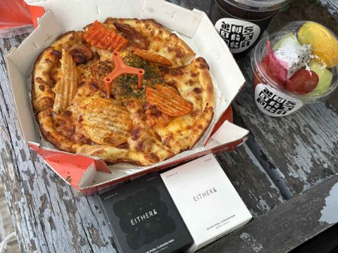 1인당 피자 한 박스,과일 컵과 음료,이더앤 쿠션까지 잘구성한 듯