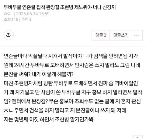 방탄 투바투 역바이럴퀴 도배질 작작하고 니 본진이나 곱게 빨아 타돌 악플 달고 억까질하고 톡선 보내고 X 유툽에서 루머유포 억까질 하는게 직업임?