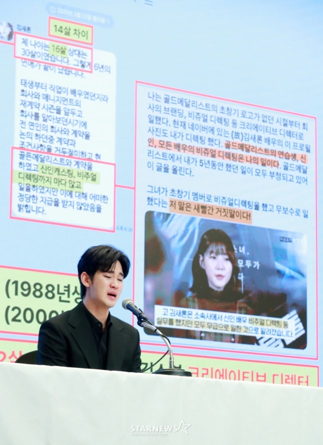 /사진=이동훈 기자그로부터 2년이 지난 올해 3월, 상황이 완전히 뒤바뀌었다. 유튜브 채널 '가로세로연구소'(이하 '가세연')가 라이브 방송을 통해 "김새론이 미성년자인 시절부터 김수현과 교제를 했다"고 폭로했다. 또한 김새론이 골드메달리스트와 계약 종료 후 7억 원을 갚으라는 내용 증명을 받아 심적 부담을 가졌다고 주장했다.증거도 제시했다. '가세연'은 김수현의 사생활이 담긴 사진과 동영상 등을 낱낱이 공개했다. 이에 김수현 측은 김새론 유족과 '가세연'을 정보통신망 이용촉진 및 정보보호 등에 관한 법률 위반(명예훼손) 혐의로 고소하며 맞대응에 나섰다. '가세연'에 대해서는 스토킹처벌법 위반 혐의로 추가 고발했다.