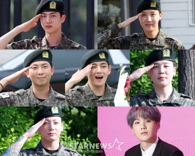 입대 순서와 동일하게 가장 먼저 전역한 멤버는 진이었다. 진은 지난해 6월, 제이홉은 같은해 10월, RM과 뷔는 이달 10일, 지민과 정국은 이달 11일 차례로 육군 만기 전역했다. 슈가도 이달 21일 소집 해제했다.
