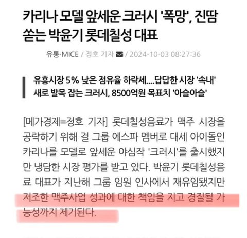 ㅁㄷ 빻리나 맥주 광고 효과없어서 폭망하셨는데 칠성이 크러쉬처럼 매출 폭망한줄 아나