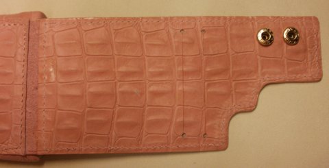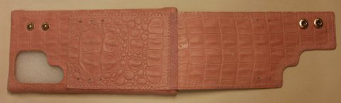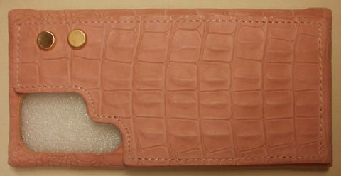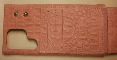 핑크 컬러 악어 무늬 엠보싱 천연가죽으로 제작한 휴대폰 케이스입니다.(마디샤가죽공예)