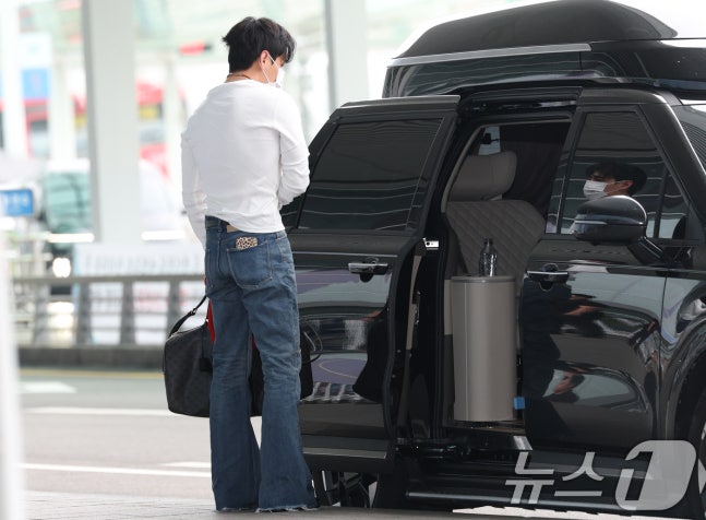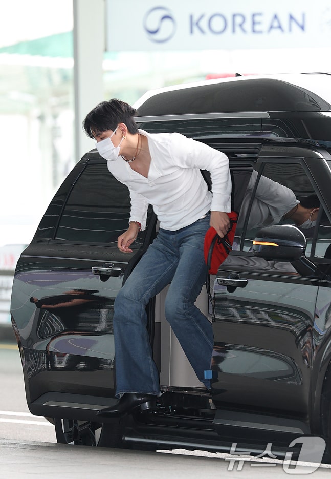 방탄소년단(BTS) 뷔(본명 김태형)가 해외 일정을 위해 4일 오전 인천국제공항에 도착해 하차하고 있다. ⓒ News1 권현진 기자