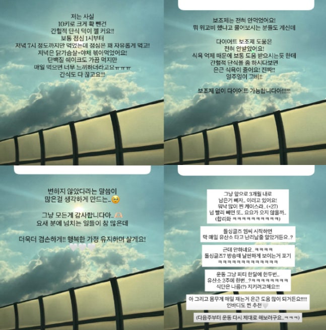 그러면서 이다은은 "운동, PT 한달에 한두번, 유산소 2주에 한번. 식단은 지키려고 한다"며 "몸무게 매일 재는 거 은근 도움 많이 된다. 인바디도 추천"이라며 운동법도 공유했다.