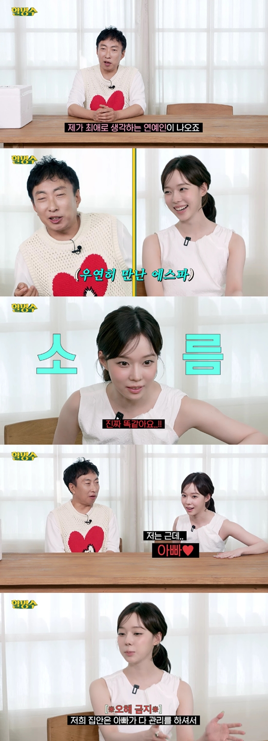 이어 윈터가 '할명수' 박보영 편을 봤다고 이야기하자 박명수는 윈터의 재산관리에 대해 질문, 윈터는 놀라며 "말하면 안 된다"라면서도 "진짜 (박보영과) 똑같다. 그런데 저는 아빠(가 관리하신다). 저희 집안은 아빠가 다 관리하신다"라고 재산 관리에 대해 설명했다.
