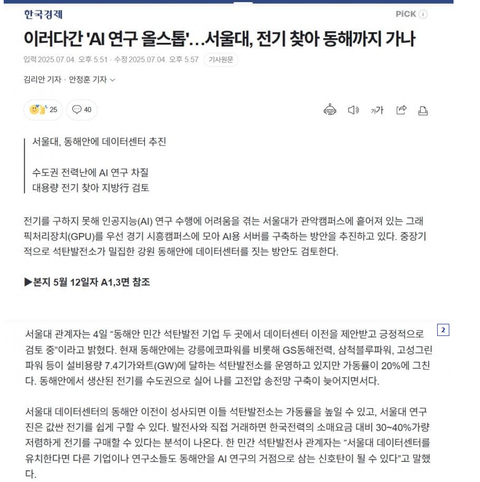 서울대가 AI연구에 차질이 막대 하다고 하네요. 이재명 이랑 민주당 그리고 1찍들은 AI산업이 얼마나 전기를 많이 갈아넣어야 하는 산업인지도 모르는 듯. '전기먹는하마'가 바로 AI산업 이라는 기본 상식도 없는 주제에 무슨 나라를 운영 하겠다고. 원자력을 더 많이 만들어서 전기를 충분히 충당해야 하는데 태양광 산업에 올인이나 하고 있고. 하기야 데이터 센터를 그 더운 전라도에 짓겠다고 하는 것들 이니까너무 무식해서 말이 통하질 않아환장할 노릇.