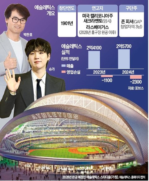 ‘코리안 특급’ 박찬호와 방탄소년단(BTS) 슈가가 영화 ‘머니볼’로 유명한 미국프로야구 메이저리그(MLB) 야구단 애슬레틱스(옛 오클랜드 애슬레틱스)의 주주가 된다. 라스베이거스로 연고지를 옮기고 홈구장을 짓기 위해 대규모 자금을 조달 중인 애슬레틱스에 7000만달러(약 955억원)를 투자하기로 했다. 이번 투자를 계기로 100년 넘는 역사를 지닌 애슬레틱스와 한국이 낳은 최고의 스포츠 스타 박찬호, 국보급 뮤지션 BTS의 협업이 이뤄질 것이라는 기대가 높아지고 있다.◇새 홈구장 건립 위해 투자 유치