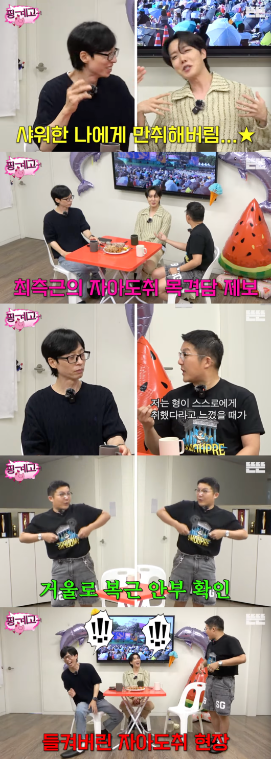 이를 듣던 조세호는 “저는 형이 스스로에 취했다고 느꼈을 때가 같이 체육관을 다니니까 운동을 한다. 형도 가끔가다가 아무도 형을 안 보고 있을 때 형이 거울보고 옷을 한번 탁 올린다”고 폭로했고, 제이홉은 “취하셨네요. 심취하셨네요”라고 빵 터진 모습을 보였다. 이에 유재석은 “잘 먹었나 확인하는 거다”라고 해명했다.
