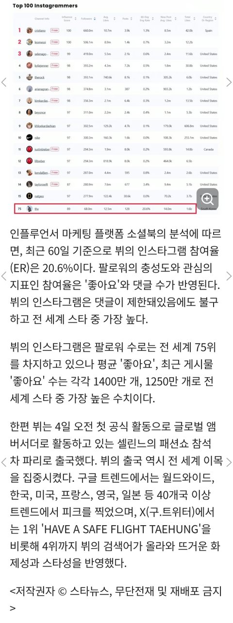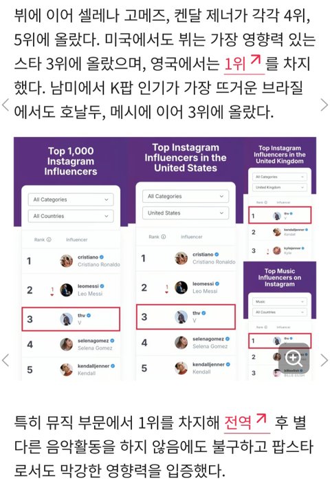방탄소년단 뷔, 호날두·메시와 나란히..'전 세계에서 가장 영향력 있는 인플루언서' 톱3