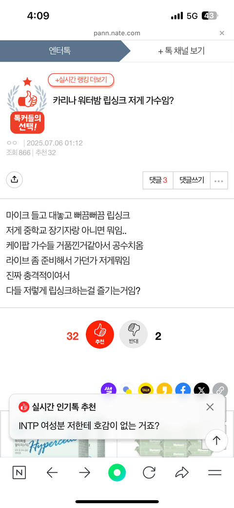 조회수867에 추천수32? 주작 ㅈㄴ심하네 맨날 까글로 지들이 주작해서 올리고 팬들이 방어댓글 올리면 그걸로 큰소리 치면서 적반하장하지ㅋㅋㅋ양심도 없네 진짜