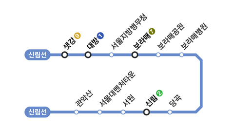 노선도 기준으로 관악산역에서 시작해 서울대벤처타운, 서울대입구, 보라매, 대방, 샛강까지 이어지며