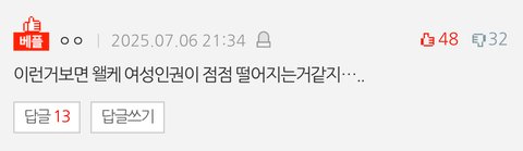 여성인권 이지랄싸네 누구보다 앞장서서 여돌들 줘패는년들이 ㅋㅋㅋㅋ 장담하는데 여초 여적여 남미새 골빈년들만 사라져도 여성인권 몇십프로는 올라갈걸? ㅋㅋ 한남들이 여혐하는것도 당연 크지만 같은 여자끼리 여적여질 해대는것도 여성인권 몇십년은 후퇴시키는데 ^^ 누구보다 여자패기에 진심인 판년들이 권은비 패면서 한다는말이 여성인권 ㅋㅋㅋㅋㅋㅋㅋ 웃고갑니다~