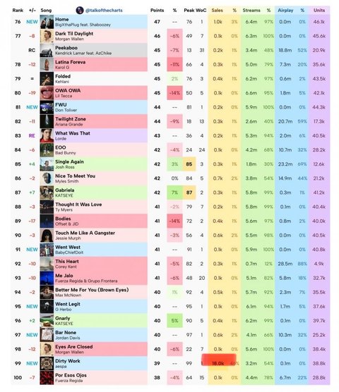 테일러 빌보드 핫백 줄세우기 할 때 세일즈가 15~18k 정도 되는데 에스파는 99위 예측이면서 세일즈만 압도적으로 18k 찍음