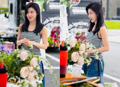 배우 하지원이 팬들이 준비한 생일 밥차를 즐기고 있다. / 하지원 개인 인스타그램줄무늬 민소매에 데님 팬츠를 매치한 하지원은 수수한 차림에도 여전한 미모를 자랑했다. 탄탄한 근육과 슬림한 몸매를 드러내며 건강미 넘치는 매력을 뽐냈다.